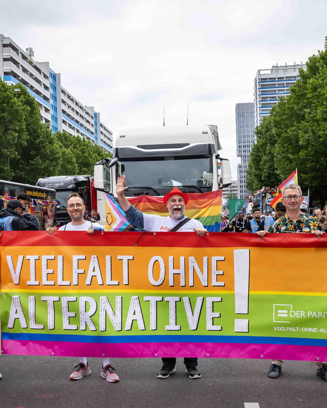 In diesem Jahr war der Paritätische Gesamtverband zusammen mit dem Paritätischen Berlin erstmals mit einem eigenen Wagen beim CSD vertreten – und wir waren begeistert, dabei sein zu dürfen. Der Wagen war nicht nur ein starkes Symbol für gesellschaftliche Vielfalt, sondern ermöglichte auch mobilitätseingeschränkten Menschen, aktiv an der Demo teilzunehmen. Diese inklusive Geste wurde von uns sehr begrüßt. Begleitet von einem DJ, der mit guter Musik für Stimmung sorgte, wurde der Wagen zum Treffpunkt für engagierte Menschen aus verschiedensten Organisationen. Rund um den Wagen wurde getanzt, gefeiert, diskutiert – gemeinsam mit anderen Mitgliedsorganisationen des Paritätischen, die ebenso wie wir Haltung zeigen wollten: Für Menschenrechte. Für Demokratie. Für Respekt.