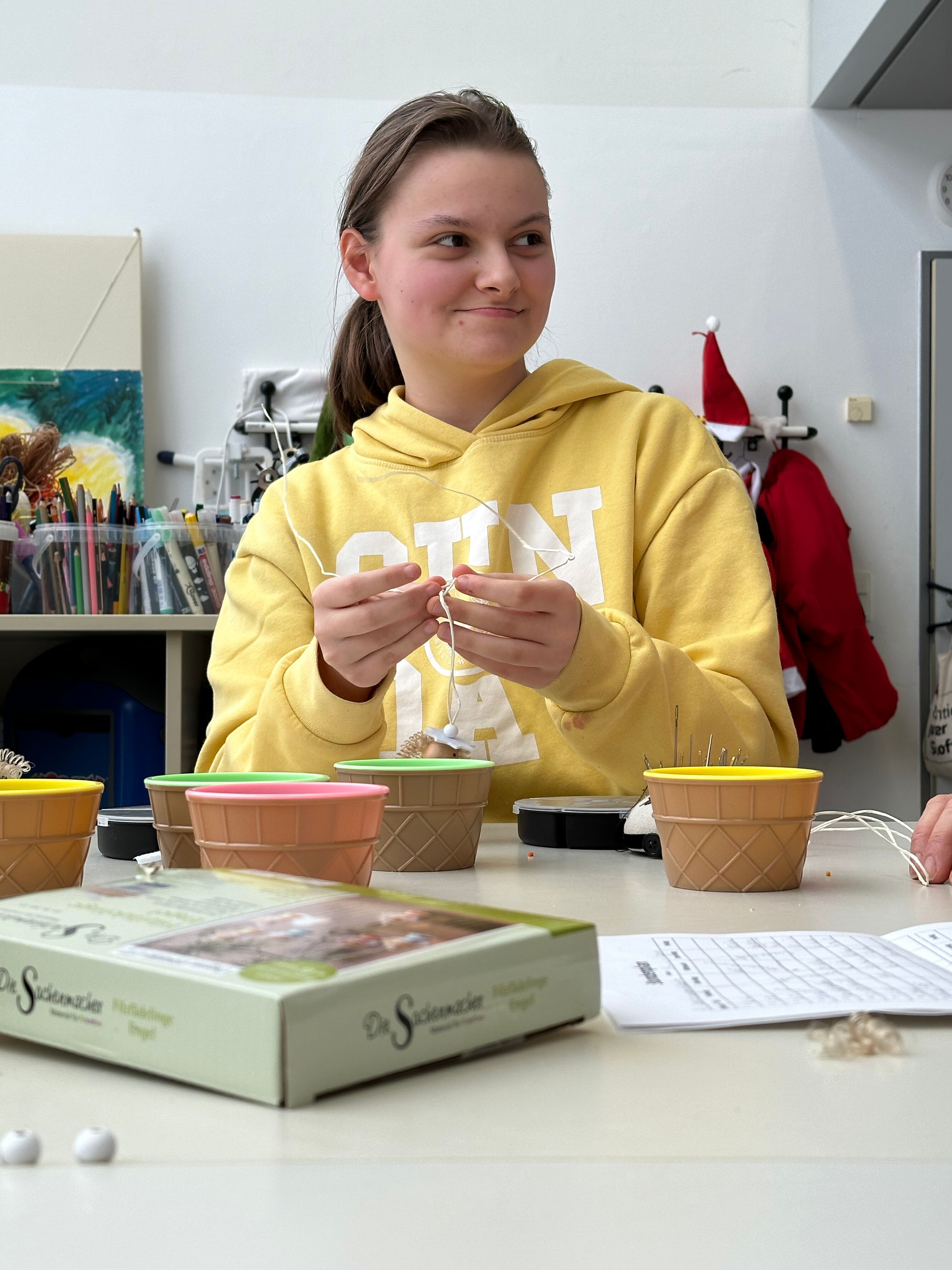 Für die jüngeren Klassen bietet sie vielfältige Möglichkeiten an, sich kreativ auszudrücken: Seifen und Kerzen herstellen, Bilder kleben, Taschen und Kissen nähen, T-Shirts bedrucken und vieles mehr. Bei unserem Besuch basteln die Kinder gerade Weihnachtsengel für den Adventsbasar. Die meisten Schüler*innen sind regulär einmal die Woche im Näh- bzw. Kreativunterricht. Spätestens zu den Märchenprojektwochen im Februar haben dann wirklich alle Schüler*innen die Möglichkeit, in die Werkstatt zu kommen. „Wir machen hier eigentlich alles, was Spaß macht. Auch mal Malen nach Musik.