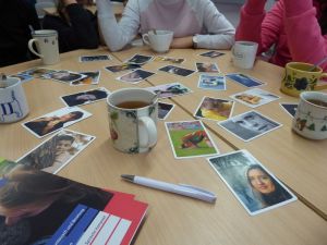 An einem der Montage bin ich zu Besuch. Fünf Mädchen sind schon da, begrüßen mich, fragen neugierig, wer ich bin und was ich mache. Gemeinsam mit Kristina Becker richten sie die Tassen und schenken sich und mir Tee ein. Es wird viel rumgealbert und gelacht, bis sich alle ihrer Schulsozialarbeiterin zuwenden. Diese hat auf einem Tisch Karten verstreut, die unterschiedliche Motive zeigen: Eine erschöpfter Sportler, eine Kind, das neugierig um die Ecke schaut, eine Frau, die sich in eine Decke kuschelt. Als Einstieg bittet sie die Mädchen, sich eine Karte zu nehmen, die zu ihrer momentanen Stimmung passt und etwas dazu zu sagen. Keine muss, jede darf etwas sagen, das ist die Regel. Reihum erzählen die Mädchen, was sie gerade beschäftigt und wie sie sich fühlen. Ein Mädchen fühlt sich hin- und hergerissen zwischen zwei streitenden Freundinnen. Ein Thema, das später noch ausführlicher besprochen wird. Ein anderes platzt damit heraus, dass ein Junge sie gefragt hat, ob sie schon schwanger werden könne.