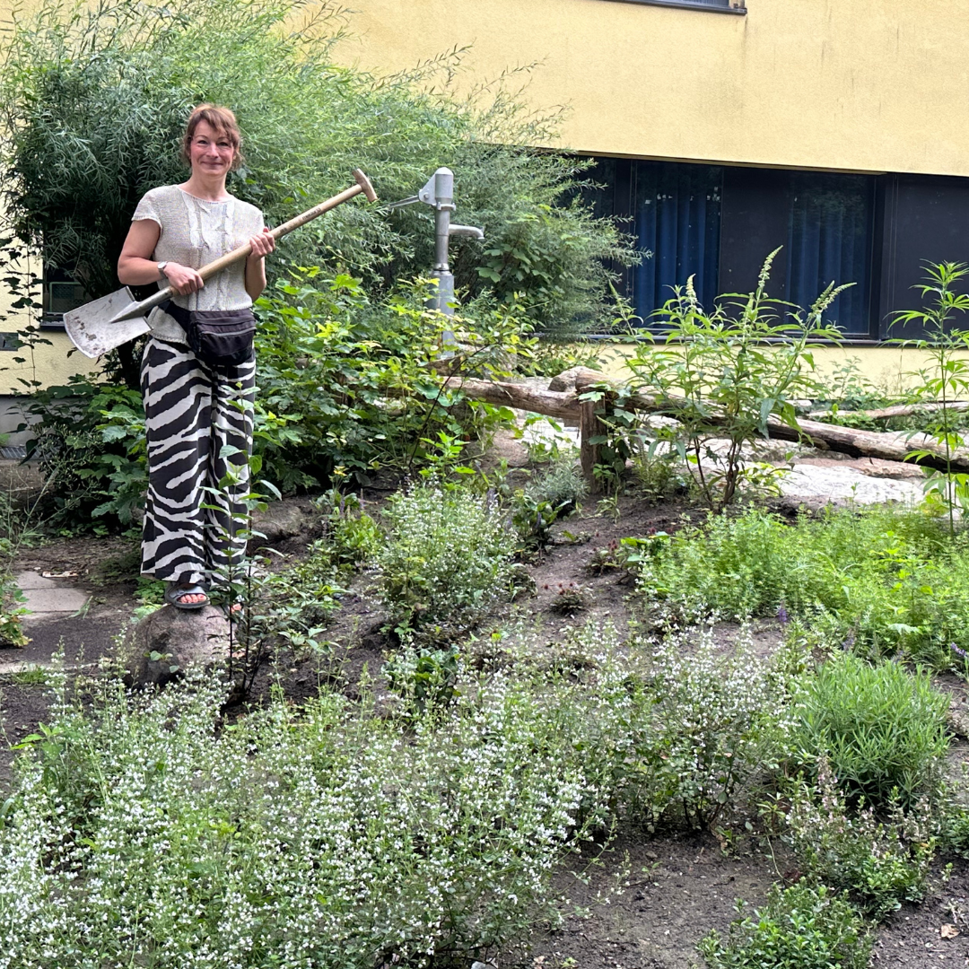 Beim Besuch der Schulstation kurz vor den Sommerferien kann man nur noch erahnen, wie traurig es beim Blick aus dem Fenster ausgesehen haben muss. Mittlerweile blühen dort wieder verschiedene Kräuter und bienenfreundliche Stauden. “Wir sind eine sehr naturverbundene Schule mit viel Grün auf dem Schulhof. Als hier ohne Vorwarnung bei uns alle Sträucher und Stauden rausgerissen worden waren, kamen die Kinder ganz traurig zu mir und wollten wissen, warum das passiert ist”, erzählt Magdalena Kurde. Sie ist schon lange Schulsozialarbeiterin an der Schule und unterstützt die Kinder auch bei partizipativen Projekten wie dem Schülerparlament. Bei einer Nachfrage beim Grünflächenamt erfuhr sie, dass auf diese Weise Geld gespart werden sollte. Eine einfache Wiese, die man nur zweimal im Jahr mähen muss, würde weniger Arbeit machen. Das Grünflächenamt ist auch von den allgemeinen Kürzungen betroffen.