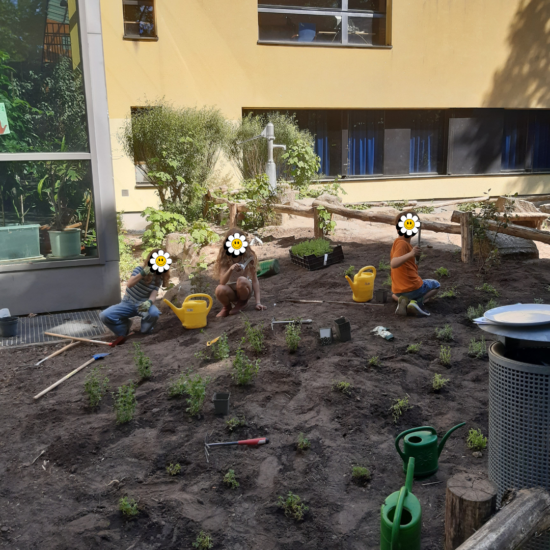 Denn die Kinder wollten nicht nur protestieren, sondern auch etwas Konkretes tun, um die Flächen wieder grün und schön zu gestalten! Außerdem wurde seitens des Bezirks deutlich gemacht: Nur, wenn die Fläche dauerhaft gut gepflegt wird, darf sie in der Hand der Schüler*innen bleiben.